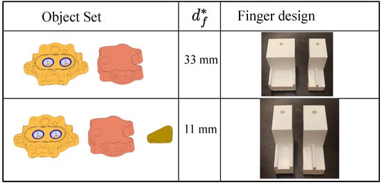 Fingertips designed to match the local shape of the object at the contact locations are called shape-matching fingertips []. They are often obtained by performing solid geometry subtraction of the part from a finger blank. Shape matching creates robust grasps because the interaction between the finger and the object is distributed over an area. It also distributes the gripping force over an area that minimizes the possibility of damage to the object. However, such a fingertip design is most suited for one object. To a limited extent, shape-matching gripping can be employed for multiple objects in two ways: (1) Different sections can be provided for in the fingertip for different objects. The fingertip becomes long in this case, and this may create unwanted collisions. (2) If the objects have different areas of interaction, two cuts/grooves can be made in the fingertip to create a shape-matching fingertip.