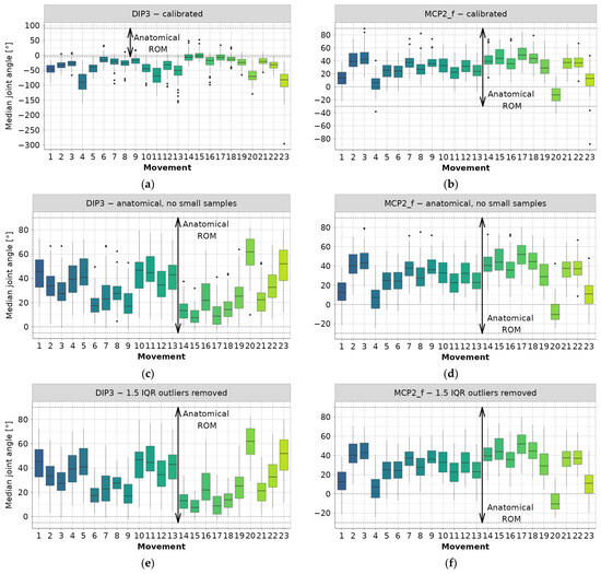 The first phase of filtering resulted in the removal of a large number of outlier values, as evident by comparing the example diagrams in Figure 1a–d. However, a significant number of outlier values still remain in the data, prompting the incorporation of a second elimination phase. This phase involves an iterative procedure, where the 1.5 IQR rule [23] for outlier detection is applied. Joint angle data is once again aggregated per joint type and movement, and medians per subject are used to calculate grouped IQR, as well as the 1st (Q1) and 3rd (Q3) quartiles. Subsequently, all subject median angles falling outside the range between Q1 − 1.5 IQR and Q3 + 1.5 IQR are deemed outliers and removed from the dataset. Data is processed through 6 iterations to remove all outliers, as shown in the examples in Figure 1e,f.