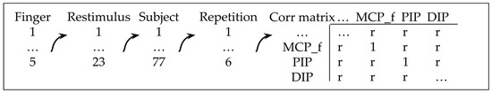 Correlation matrices, which serve as indicators of linearity, are generated for all flexion/extension joints belonging to the same finger, as well as for each motion, subject, and repetition separately, using the procedure outlined in Figure 3. It should be noted that 71,328 correlation coefficients (r) are obtained, ranging between −1 and 1, with between 56 and 358 coefficients present for each joint dependency. This provides, in the authors’ opinion, sufficient statistical power to conclude the nature of the dependency. The significance level for the correlation coefficients was set to 5%.
