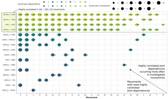 The sampling yields 11,643 usable correlation coefficients. In Figure 5, the dependency-movement diagram assigns each point a median correlation coefficient, illustrating the grouping of highly correlated intra-finger dependencies per movement.