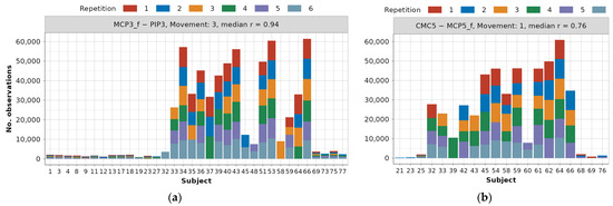 Examining Figure 2 further, it is evident that in the case of certain subjects (e.g., subjects 14 and 38), a notable portion of the data was eliminated during earlier preprocessing stages. Additionally, due to the same reason, subjects 1–15 will have minimal impact on little-digit joint dependency modeling. To minimize the effect of unbalanced data and retain variability and generalization ability, it is therefore decided that dependencies will be observed on a repetition level, and each subject repetition will be used as a self-sufficient unit for data analyses.