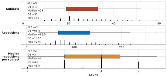 To validate the captured variation, a summary of the remaining data per dependency-movement is shown in Figure 7. The minimum number of subjects in the subsequent modeling part is 9 per single dependency-movement relationship, although, in the middle 50% of cases, it spans 19 and 33. The number of repetitions, which will be observed as a single enclosed data unit, ranges between 25 and 274 per dependency-movement. The midspread of repetitions per subject is between 3 and 4.5.