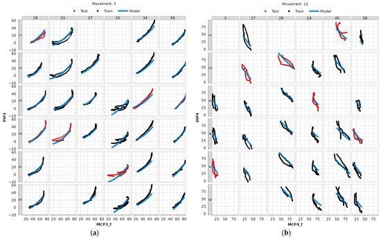 Examples of LME model fitted to data (blue) with repetitions belonging to train data (black) and test data (red). Numeration at the top represents the subject ID, and numeration to the left the repetition ID: (a) MCP3_f—PIP3 dependency for movement 3 (fixed hook grasp), (b) MCP4—DIP4 dependency for movement 12 (precision sphere grasp).