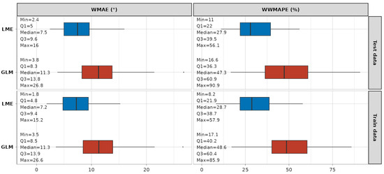 A summary of the statistics on the error metrics is depicted in Figure 11. It is evident that, when compared to GLM models, the LME models fit the data with much smaller absolute and relative errors. The absolute WMAE for the LME approach across models ranges from 2.4° to 16° (median 7.5°) on the test dataset and from 1.8° to 15.2° (median 7.2°) on the train dataset. The relative WWMAPE for the same approach ranges from 11% to 56.1% (median 27.9%) on the test dataset, and from 8.2% to 57.9% (median 28.7%) on the training dataset. The detailed graphical results of the error metric analyses are provided in Appendix A (Figure A3 for WMAE and Figure A4 for WWMAPE), while a detailed table representation for readers’ reference can be found in Table S1.