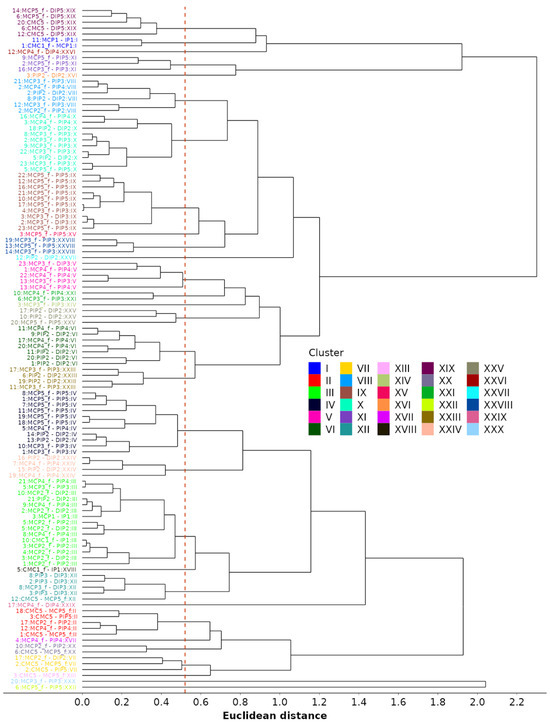 Lastly, we perform agglomerative clustering based on standardized coefficients. The goal is to identify similarities between dependencies across different motions. The clustering is performed using both fixed and random effects from the LME models and by substituting the missing coefficients with zeros. The distance matrix with pairwise distances between each of the 116 identified models is computed using Euclidean distance as a metric for similarities between model coefficients. Then, clustering is performed using “complete” linkage, where the metric for joining existing clusters is the largest distance between two dependencies (one from each cluster). The method is also called “farthest neighbor clustering”. The resulting dendrogram is depicted in Figure 12. The authors estimate that 30 color-coded clusters, obtained by cutting the tree at a distance of 0.52, are appropriate for reducing the number of models. This number was obtained by visually inspecting the dendrogram in Figure 12, as well as by ensuring that the average absolute difference between standardized coefficients, when taking into account an average of 2.5 coefficients per model, remained below 0.33. The clustering method not only reduces the number of models required to describe all kinematic reductions from 116 to 30 but also the number of models used for the kinematic characterization of each grasp type (see Table 5). The investigation of the finger flexion/extension during all functional movements, initially involving 16 DOFs, can therefore be reduced by up to 11 DOFs, with a median of 4. Thus, the remaining flexion/extension grasp models comprise between 5 and 15 independent DOFs, with a median of 12. Considering model clustering, the number of reduction models per grasp ranges from one to nine, with a median of four.