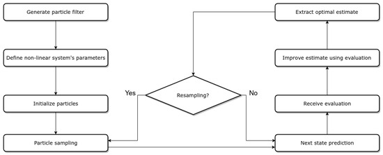 The particle filter approach requires as input the previous set of particles, a motion, and a measurement model for the specific UAV. The process followed by the particle filter is described in