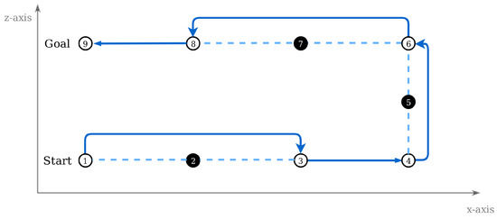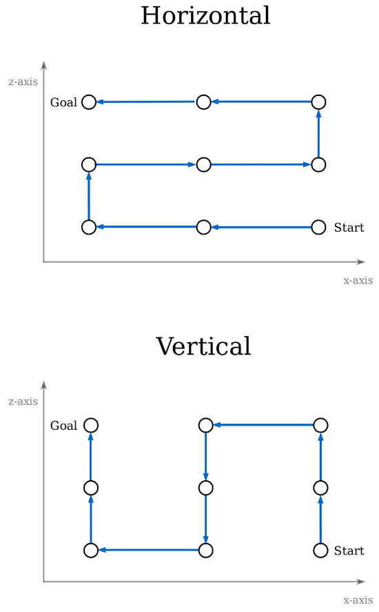 Since an optimal path in the two-dimensional space has been found, the solution can now be transferred to the 3D space. Two methods are applied for this transformation, the vertical and horizontal connection of waypoints, as shown in