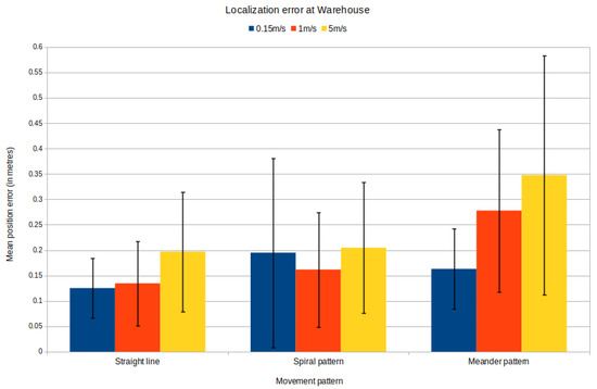 Section 4.5. It is necessary to ensure that the localization system is working and is supporting safe and stable navigation throughout the environment. The maximum speed used in all experiments is the slow one, as it provides the lowest error for every type of movement, according to