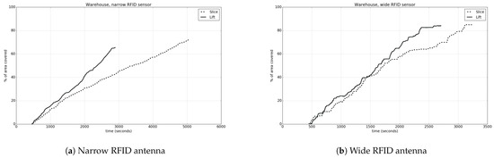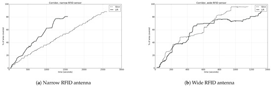 The purpose of the full-coverage experiments is the calculation of the area percentage that was covered within the environment, as well as the time needed for this process. Again, the experiments were conducted in the corridor and the warehouse environments, and the sensor responsible for covering the environment was a simplified, simulated RFID antenna in two variations (narrow and wide), described by the parameters shown in
