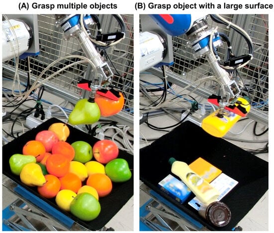 With the growth of e-commerce, demand for the automation of bin picking by robots in warehouses has become high [1], particularly in Japan, since the country is faced with a labor shortage due to its aging society. COVID-19 has made the situation worse since picking tasks in warehouses is not amenable to telework. Most state-of-the-art robotic picking systems focus on single-object grasping. To further improve the efficiency of these systems, simultaneous grasping of multiple objects might reduce the number of pick attempts to improve the picking speed, as shown in Figure 1A. In addition, a robot can more stably grasp and hold objects that have a large surface using multiple suction cups to grasp the object, as demonstrated in Figure 1B.
