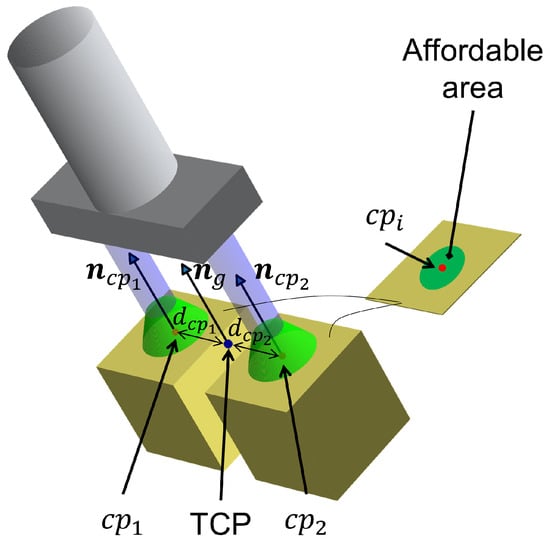 The gripper TCP and all contact points located in affordable areas are in the same plane, which is perpendicular to the unit vector of the gripper’s z-axis ().