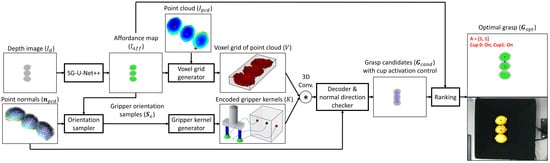 As A is a one-hot vector, the sum of A is the number of suction cups to be used. Therefore, we determine the indices () of V where the sum of A is greater than or equal to two () in order to find the voxel grid indices where multiple suction cups can be used to grasp multiple objects or an object with a large surface area. is further converted to TCP positions in world coordinates ( in Algorithm 4), and the corresponding orientation , cup center positions , and target activation status can be obtained to generate the grasp candidates (), as in lines 12–15 in Algorithm 4.