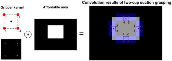 The kernel representing each candidate gripper orientation generated in Section 5.4 is created using 3D convolution to determine the graspable position for each , as in Algorithm 3. A binary kernel is used to represent gripper poses in previous studies using 2D convolution [39]. However, the convolution results can only determine the graspable position of the kernel and cannot directly determine which suction cup to activate. For example, as shown in Figure 5, although the convolution results for the four cases are the same, the suction cups chosen to be activated are different and cannot be directly determined from the convolution results. Hence, we design a 3D kernel that includes the suction cup ID information. Algorithm 3 is used to generate kernels of . The shape of one kernel is , where . is the maximum distance of the suction cup center to the TCP in local gripper coordinates, and l is the grid size of the kernel, which is equal to that of the voxel grid. The kernel indices of cup centers are , where C is the cup center position of . The kernel grids at cup center kernel indices are filled with encoded vacuum ID information as in line 9 in Algorithm 3. Here, the ith suction cup ID information is encoded as , such that the cup ID is saved in the ith decimal place, and such encoding helps to directly obtain the target suction cups to activate from the decoding convolution results (see Section 5.7).
