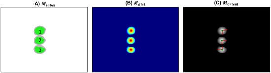 Clustering results. (A) Label map . (B) Distance map . (C) Orientation map . Numbers in (A) is the cluster Id. (B) is the heatmap of the distance to the center of the clustered area. Green points and red lines in (C) are center positions and axes of clustered areas.