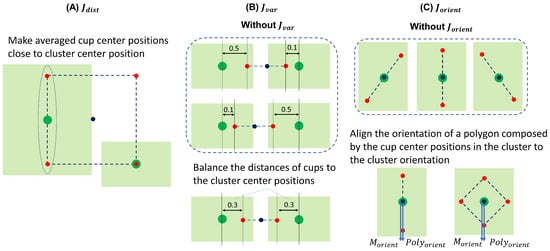has been incorporated because there are cases where one cup is near, but another cup is far from the cluster center, and cannot evaluate these cases. is used to balance the distances of cups to cluster center positions. Specifically, as in Equation (9) and Figure 7B, evaluates the variance of the value at the position of average cup center positions.