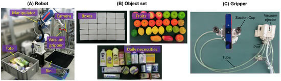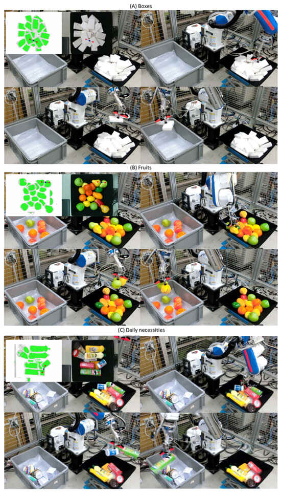 To evaluate the robot picking system and efficiency improvement using the multiple-suction-cup grasp planner, we conducted picking experiments and compared the results of single-cup (single-object) grasping and multiple-cup (multiple-object) grasping. The robot with a two-cup vacuum gripper was used to pick items from a bin and then place them into a tote (Figure 8A). Figure 8C shows the gripper architecture. The gripper was equipped with PISCO (PISCO CO., LTD., Nagano, Japan) standard suction cups. We used a cup with a 20 mm diameter because it can generate sufficient force to grasp and hold objects (weight less than 500 g) used in experiments under our vacuum pump setup. The cups were connected to vacuum ejector ports by tubes. Each ejector port controlled the on/off of the corresponding cup by supplying (on) or blocking (off) compressed air. A camera was installed in the center of the gripper, which captured the depth image at the robot’s home position. The affordance map was then inferred by SG-U-Net++ based on the depth image. For single-object grasping, the planner in our previous work [14] was used to find the position of maximum affordance value and selected the suction cup that can be used to reach the target grasp point by the shortest trajectory. For multiple-object grasping, a multiple-suction-cup grasp planner was first used to determine grasp poses capable of grasping multiple objects or an object with a large surface area using multiple cups. If there was no solution, the planner was switched to the planner for single-object grasping. Trajectories from the home position to grasp poses were generated by MoveIt. As shown in Figure 8B, the target object set included boxes, fruits, and daily necessities. The robot was required to pick 50 boxes, 50 fruits, and 51 daily necessities in a cluttered scene. The robot continued grasp attempts until the scene was cleared. A grasp attempt was considered to have failed if the robot could not pick up the item or the item was dropped during the movement of the manipulator. The results of single-object grasping and multiple-object grasping were evaluated and compared by success rate, picks per hour (PPH), and number of pick attempts. The success rate was defined as the number of successful attempts divided by the number of pick attempts. PPH was defined as the number of objects the robot could pick up in 1 h. The number of pick attempts was defined as a number of attempts for the robot to clear the cluttered scene.