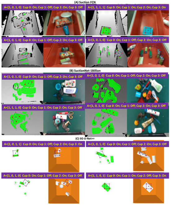 Examples of grasp planning results for two-cup and four-cup vacuum grippers. (A) Suction FCN. (B) SuctionNet-1Billion. (C) SG-U-Net++. Red dots are the center positions of the cups. Dark blue dots are the center positions of the the gripper.
