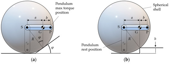 Consider a spherical robot on a flat surface with a pendulum hanging from a diametral shaft. In the rest configuration, the pendulum is vertical and the system is balanced; otherwise, the system is subjected to a driving torque due to gravity. For instance, when the pendulum is horizontal, the driving torque is maximized. By extending this reasoning to the cases of inclines and steps, it is possible to evaluate the spherical robot’s ability against obstacles. Two performance parameters, the Maximum Step Height (MSH), and the Maximum Slope Angle (MSA), can be introduced. These parameters are illustrated in Figure 1, with representing the MSH, and denoting MSA. In the same picture, the barycenters of spherical shell, pendulum and whole system are indicated with , and , respectively.