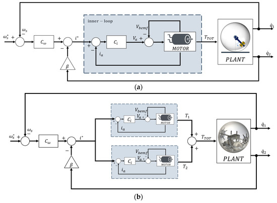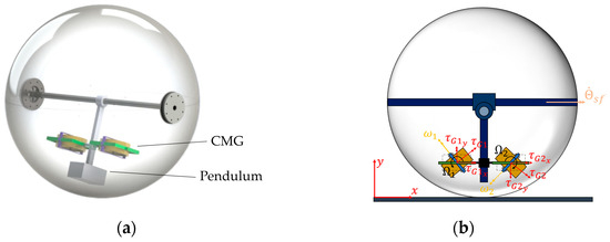By assuming that is the rolling axis of a sphere, the component of is unwanted. Moreover, the tilting action would require an actuation torque, which would be a disturbance for the sphere. A solution can be achieved using a second CMG in such a way that the effect along the direction of interest is doubled, while the other component is canceled out. To do so, the two gyroscopes must have opposite and . When the gyroscopes are used in this configuration, they are also known as scissored-pair control moment gyroscopes. In Figure 2b a scissored-pair CMG is shown, mounted inside a spherical shell.