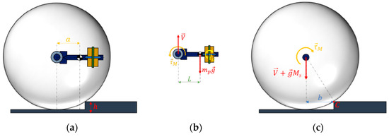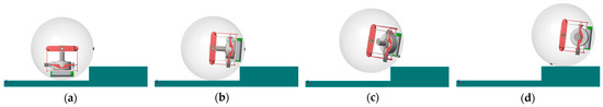 Without gyroscopes, step height is a 10th of the radius, as noted in [1]. In Figure 5 is considered , as this is the initial condition. However, the gyroscopic torque’s useful part changes with tilt angle, as from Equation (2). As the gyroscopes tilt, the effective distance decreases until it matches the initial value . Yet, the torque for climbing a step decreases as the robot ascends. Also, is not solely determined by gyroscopic torque but also by the system’s total mass.