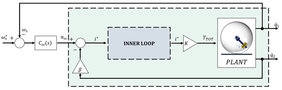 The P controller gains have been chosen with the objective of providing a faster convergence of the output to the reference value. Consequently, higher gains were selected with respect to the ones of the PID1, namely, kp = 4, and ki = 10. As already mentioned, to control the activation of the P controller, a set/reset block has been incorporated before it. This block enables the controller to operate only when the error is close to zero. Specifically, if the speed reference is greater than 4 rad/s, the controller starts working when the error is less than the 8% of the speed reference, while it is deactivated if it overcomes the 20%. For speed references below 4 rad/s, the percentage error is calculated relative to this velocity. The use of different threshold values (8% and 20%) for activating and deactivating the controller avoids chattering issues.