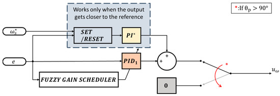 The SR is a highly non-linear system, and for this reason, a nonlinear controller is adopted. A scheme of the overall speed controller is shown in Figure 13. It can be observed that PID (Proportional Integral Derivative) and PI (Proportional Integral) controllers are used. The first one (PID1) relies on a fuzzy gain scheduler logic to perform an on-line tuning of the PID gains based on the error signal. The second one (P) is characterized by constant gains and it works only when the output gets closer to the reference input. Its objective consists of ensuring a faster convergence to the desired value, limiting the response overshoot. A set/reset block is responsible for turning on or off the P block, depending on how close the system response is to the reference input.