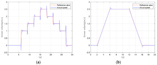 Actual velocity of the simulated sphere versus velocity set. (a) Step; (b) trapezoidal.