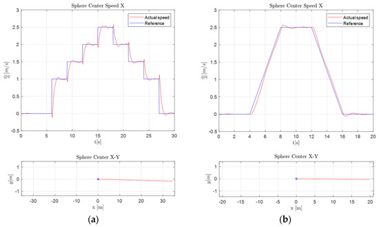 It can be noted that the response is not as accurate as that of the analytical model, but both the velocity profiles are still well tracked by the SR. Under the sphere center speed graphs, the path followed by the robot in the XY plane during the maneuvers can be observed. It can be noted that, in the first scenario, there is a slight deviation in the negative direction of the y-axis. However, this deviation accounts for less than 0.5% of the length of the displacement along the x-axis. In the “Supplementary Materials”, the reader can find an example of simulation of a straight trajectory obtained with the presented control strategy.