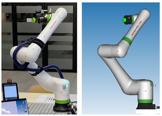 The FANUC CRX-10iA is a 6 Degrees of Freedom (DoF) cobot with a 6R serial architecture (Figure 1). Its compact design and high reliability (the constructor gives a position repeatability of 0.05 mm) allows for the easy integration into any work area making it very popular in industry and robotics research. As a collaborative robot, it is intended for applications that include human interaction. It offers then all the safety guarantees (speeds, forces) required for this purpose. In fact, its sleek design, devoid of sharp edges, and illuminated indicators are all tailored for safe interaction and collaboration with humans.