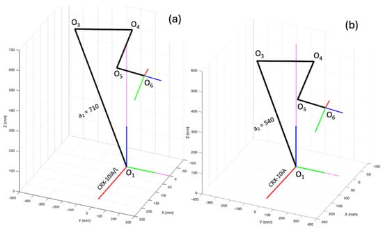 We tested this joints configuration [] on the two cobots CRX10-iA/L and CRX-10iA. The postures are represented in Figure 4, and they differ only because of changes in the parameter .