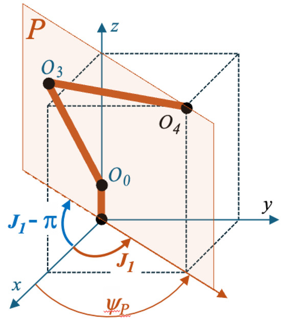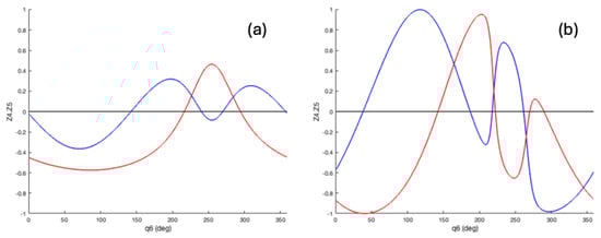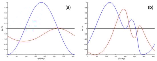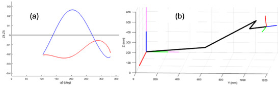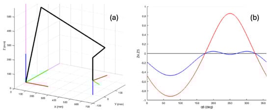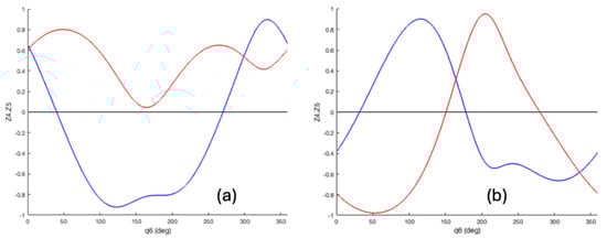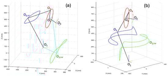 This phenomenon mirrors what occurs with a spherical wrist configuration. Consequently, we can observe identical values in lines #1 and #5 of Table 5 ( = −14.478°) and the exact opposite values in lines #4 and #6 ( = + 14.478°).