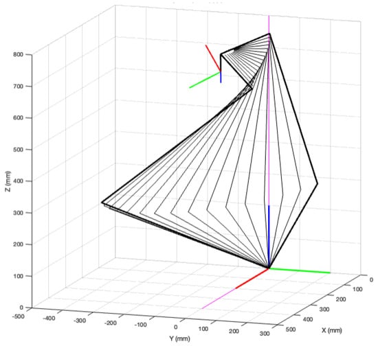 This example demonstrates the existence of a -, with 16 solutions, as shown in Figure 14. The 7th image of this figure corresponds to the cobot posture represented, in black, in Figure 6b. All of the 16 configurations were verified using Roboguide software (version 9).