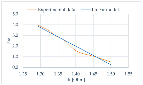 Tests were conducted to characterize the wire’s unitary deformation (ε) relationship with electrical resistance (R) to obtain the model for self-sensing implementation. In particular, the model was obtained for the actuator in an antagonistic configuration with a bias spring. The resulting model was represented as a linear one