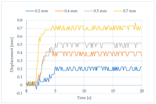 Positioning tests were conducted using the model and the setup described. A precision potentiometer connected to the pulley [41] was added to acquire the actual position using a data acquisition board. It turns out that the actuator works well over the entire operating range (0.7 mm), except for the value close to the minimum length, i.e., for an elongation equal to 0.1 mm. Figure 3 shows the system responses for stepped input signals. There is an error due to oscillations of approximately 0.04 mm.
