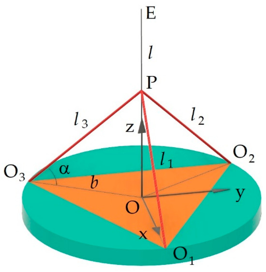 Following the specifications above, the kinematic architecture of Landsberger’s robot is considered [39]. A system consisting of a base and a platform, with the dimensions of the platform reduced to zero, is considered according to the scheme in Figure 1 [40].