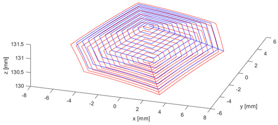 In Figure 3, it is shown that the single actuator positioning error was about 0.02 mm. A mapping of the errors in the working volume was derived through an estimation of the influence of the errors of the three actuators using the direct kinematic model. The calculation was carried out by commanding movements equivalent to the documented errors and combining them in the worst combination of the three actuators, which corresponds to double the amplitude of the error of a single actuator. In Figure 11, the derived map is shown. It can be seen that the error is relatively constant over the working volume. The maximum values occur at three vertices where two actuators are near the maximum contraction, and a higher movement amplification effect of the cable system occurs.
