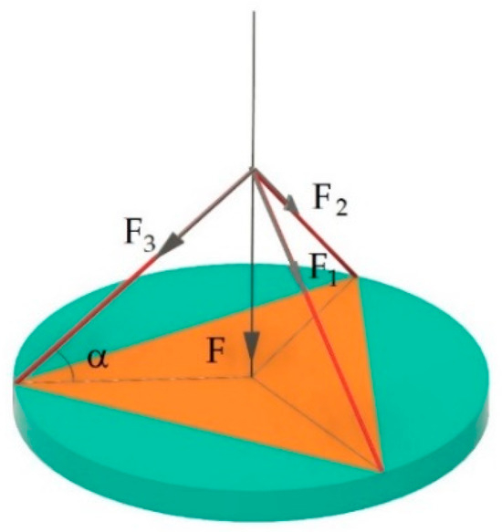 The force developed by the actuators Fi and their resultant F along the end effector rod axis. The spring has to apply a force opposite to F, as given by Equation (24).