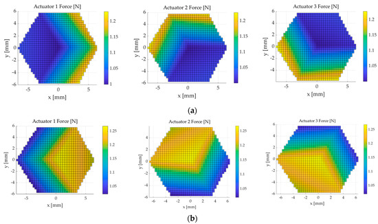 Using this model, a dynamic analysis was carried out on the entire boundary of the working volume to verify the spring. Figure 7 shows the results obtained with the dynamic model. Figure 7a shows the actuator’s forces with the end effector lying on the upper working volume boundary, while Figure 7b shows the forces with the end effector lying on the lower working volume boundary, in contrast with the bias spring. The maximum spring force occurs on the lower boundary and is equal to 1.98 N, and the actuators’ force has to be equal to 1.26 N for the equilibrium. Thus, since the actuators are capable of a force of 3.2 N, there is a margin to apply loads on the environment. On the upper boundary, the spring applies a minimum force of 1.69 N, and the actuators apply a minimum force of 1.22 N for the equilibrium. Since the actuators require a force of 0.6 N to be stretched at low temperatures, the spring is able to keep them taut and return them at maximum length, providing a margin to apply loads on the environment.