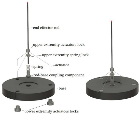 The components were designed in detail. The base is circular with a thickness of 6 mm and a diameter of 40.8 mm, and it was realized in nylon. In the center, a spherical groove is present for the articulation with the rod. The joint is realized by a spherical component with a diameter of 4.5 mm for the articulation to the base side, with a diametral hole for coupling with the rod. This one, with a diameter of 1 mm, can slide inside the hole to confer on the robot a third degree of freedom. The spherical component presents, in the upper part, a plane surface, which constitutes the base on which rests the lower extremity of the spring. The rod presents a lock for the upper extremity of the spring formed by an axisymmetric component. Above it, there is a cylindrical component for the lock of the upper extremity of the actuators. Finally, on the base, there are three holes disposed at 120° angular distance from each other, where the locks are coupled for the lower extremity of the actuators. Figure 8 shows the CAD model of the designed prototype.