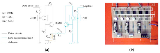 The board used for the measurement of the electrical resistance and the driving of the actuator. (a) The electric scheme; (b) the physical homemade board in which the electric scheme was replicated three times for the three actuators: (1) controller connector, (2) Rc electrical resistances, (3) 4N33 optocoupler, (4) Rp electrical resistances, (5) BC288 transistors, (6) Rm measuring electrical resistance, and (7) Ni-Ti actuators connectors.