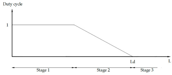 Control logic scheme: in stage 1, far from the target, the control supplies the maximum power. In stage 2, close to the target, the control becomes proportional. At stage 3, overcoming the target, the control cuts power off.