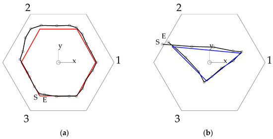 Trajectory tracking tests. The numbers 1, 2, and 3 represent the directions through which the action of the corresponding actuator moves. The letters S and E represent the trajectory’s start and end positions. The circles represent the points of the actual trajectory. (a) Representative case of the first trajectory-tracking test: the reference (red line) is an almost regular hexagon with an edge of 4 mm. (b) Representative case of the second trajectory-tracking test: the reference is a general triangle (blue line).