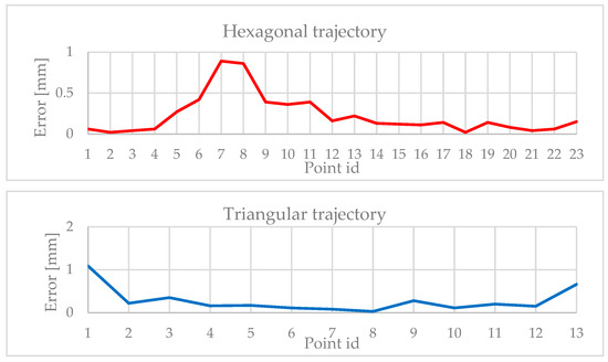 The hexagonal trajectory test shows a maximum error of almost 1 mm in a confined zone, while in the rest of the trajectory, the error is less than 0.2 mm. The triangular trajectory test shows similar maximum and minimum values for the errors.