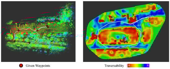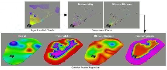 As the goal of this process is to provide an implicit representation of the ground surface height, traversability and distance to obstacles, the compressed points produced by each of the previously described processes can be used as training points for the calculation of a GPR [38] of these variables over a 2D horizontal plane. A correlation matrix is computed on the set X of compressed 2D point coordinates where each element of the matrix stores the correlation between two points and defined by the correlation kernel such that . The correlation vector between any 2D query point q and the training points is calculated as . The latter are used to infer the values of T, d and h at the query point coordinates as shown in Equation (16), where , and respectively denote the vectors of all training outputs , and corresponding to the training points in X.