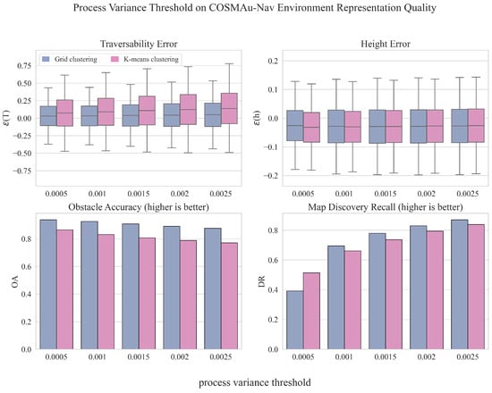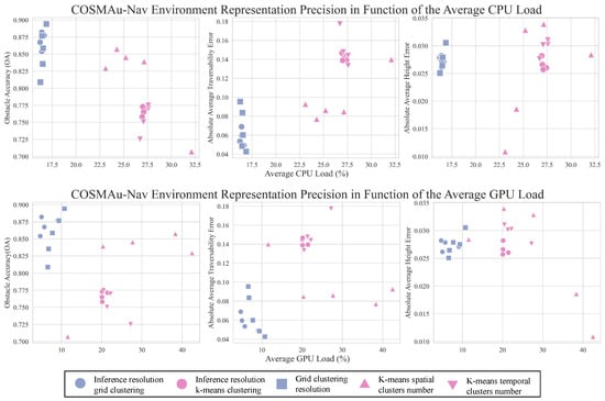 As the main objective of this study is to obtain the best ratio between the produced environment representation quality and its computational requirements, a summary of its results is presented in Figure 5 which displays the average obstacle accuracy (), absolute average terrain traversability error () and absolute average terrain height error () in function of the average induced CPU and GPU loads for all the evaluated parameter values. Figure A1 displays the detailed influence of grid clustering resolution and k-means number of clusters for spatial and temporal compression over all representation quality and computational performance metrics.