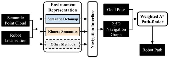 For evaluation and comparison purposes, the previously developed general-purpose Semantic Mapping and Navigation Architecture (SMaNA) [2], which features a generic navigation grid interface has been used as reference. Two reference discrete explicit semantic mapping methods, described in Section 5.3.1 below have been implemented in the architecture. It employs a weighted A* path-planner as a simple and commonly used method for semantic-aware navigation [23,43,44]. The SMaNA ROS architecture can use a variety of methods for semantic mapping to build a 2.5D 8-connected navigation graph. The latter consists of a 2D grid with parameterised resolution where each node contains an occupancy counter , a height value and a traversability value . The interface between the mapping methods and the graph building is specific to each method, but the graph data structure and usage are unified for all methods (Figure 7).
