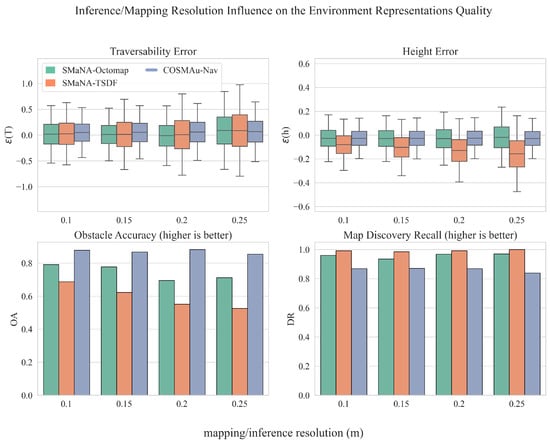 The influence of mapping and inference resolution on the previously described metrics has been evaluated for four different resolution values (10 cm, 15 cm, 20 cm and 25 cm).