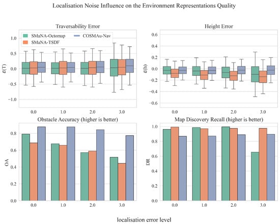 Results of the comparative evaluation of COSMAu-Nav environment representation process with the application of Semantic Octomap and Kimera Semantics in SMaNA in terms of environment representation quality in function of the robot localisation noise.
