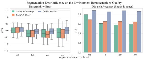 Results of the comparative evaluation of COSMAu-Nav environment representation process with the application of Semantic Octomap and Kimera Semantics in SMaNA in terms of environment representation quality in function of the semantic segmentation error level.