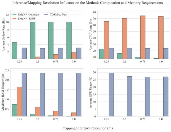 Figure 12 presents the comparative results of this evaluation: the environment representation update rate, total RAM consumption and CPU usage for all methods, and GPU usage for GPR. This evaluation shows that COSMAu-Nav is in fact more expensive to run in terms of memory consumption than both other methods but requires less CPU load than Kimera. It produces updates of the environment representation at a lower rate than the Octomap but higher than Kimera and is still suitable for online usage. In overall, the RAM, CPU and GPU load measured during these evaluations remain in a manageable scope for the employed computer and allow COSMAu-Nav to be used alongside other processes that can be needed in a robot navigation mission such as SLAM or semantic segmentation.
